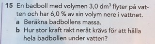 Jag har fastnat på b) uppgiften. Det enda jag har kommit fram till är om allt är i vattnet är dess Fg=1000*3*10⁻³*9,82=29,46 och då bör lyftkraften vara lika stor, men jag förstår inte hur man gör med den ytterligare kraften. Svaret i facit är 28N.
