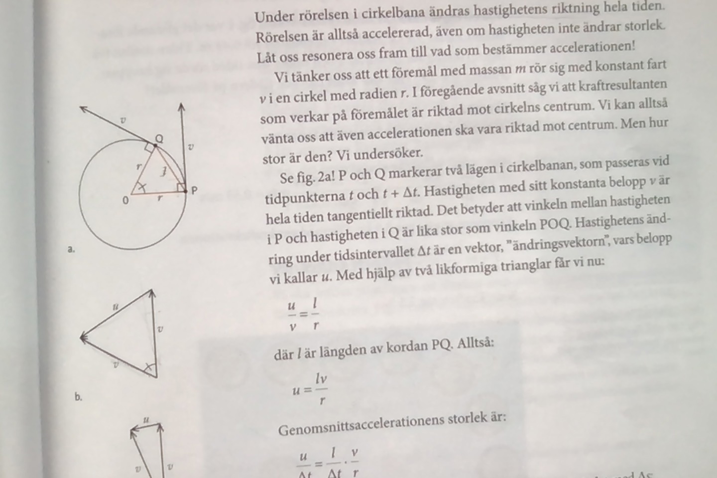 Hur vet jag att vinkeln POQ är densamma som vinkeln mellan hastigheterna bara genom att veta att hastigheterna är tangenter till cirkeln? Om Q hade varit en punkt mittemot P (180°) hade det ju inte varit fallet tänker jag.