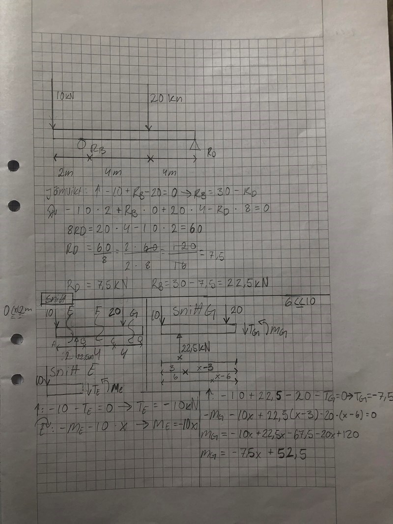 Snitt G beräkning av MG , reaktionen RB verkar vid x-2 m osv