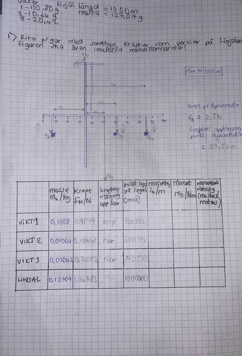 Men vad ska jag fylla i momentarm, Moment,Momentets riktning respektivt? Och vilka mer krafter verkar på linjälen förutom FN och Fg??