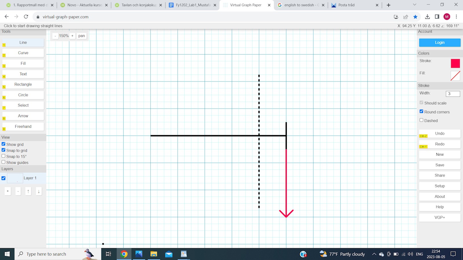 (Den ritade kraften är tavlans tyngdkraft och streckade linjen är väggen och vi säger spiken är 5 cm)