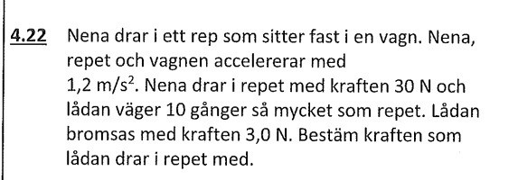 och (resulterande) kraften som accelererar lådan är 10x större än (resulterande) kraften som accelererar repet.