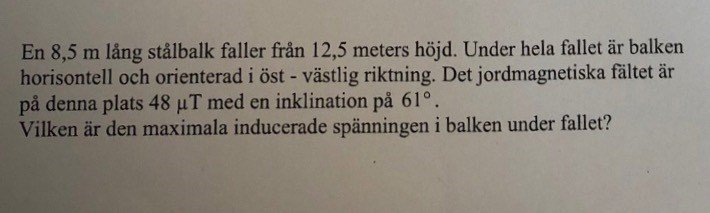 eeemmeliiie skrev:Smaragdalena skrev:Balkens orientering är densamma under hela fallet, det jordmagnetiska fältet är konstant till storlek och riktning. Hurdan skall hastigheten vara för att den inducerade spänningen skall vara så stor som möjligt?