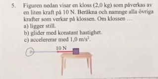 Figuren nedan visaren kloss (2,0kg) som påverkas av en liten kraft på 10 N. Beräkna o namnge alla övriga krafter som verkar på klossen. Om klossen...