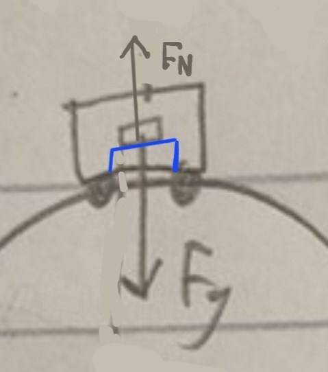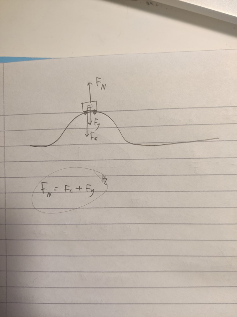 Ja, men jag tänker att eftersom bilen åker över backen, och inte dras under marken av en kraft, borde normalkraft när de åker vara lika med Fg och Fc, eftersom bilen inte åker ner i marken. Alltså tänker jag att Fc+Fg=Fn. Men hur är det inte så?