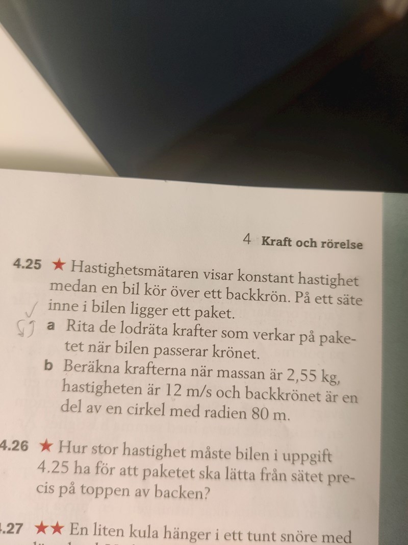 I a-uppgiften skall man rita de lodräta krafter som verkar på paketet när bilen passerar krönet, d v s när bilen är på toppen av backen.
