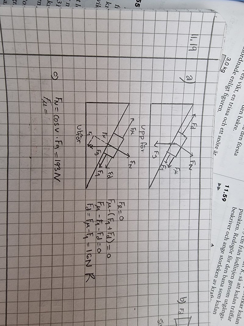 "För att släpa en back mjölkkartonger med tyngden 200N med konstant fart uppför en lutande ramp krävs dragkraften 120 N parallellt med rampen. Friktionskraften är 68N."