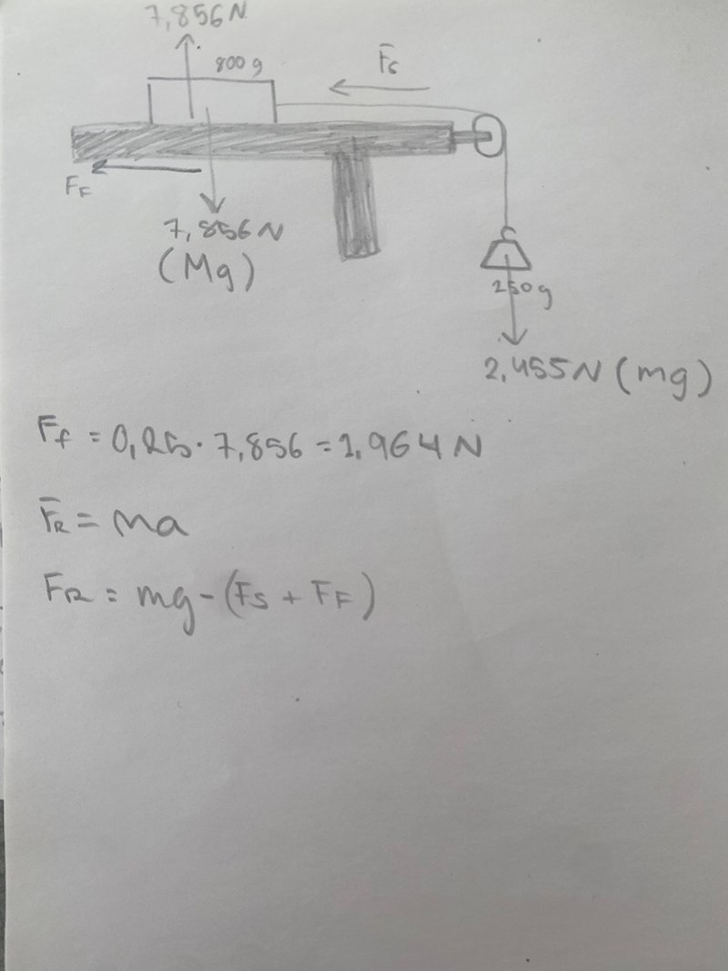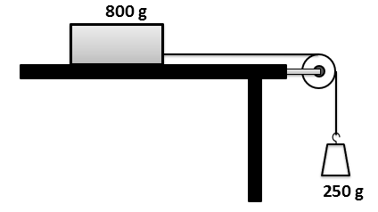 En kloss med massan 800 g ligger på ett bord. Via ett snöre och en friktionsfri trissa är klossen fäst vid en vikt med massan 250 g.