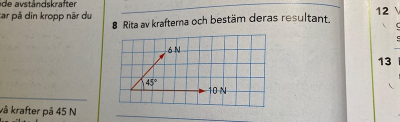 I det här fallet har du 10 N som drar åt höger. Du har även 6 N som drar snett upp åt höger.