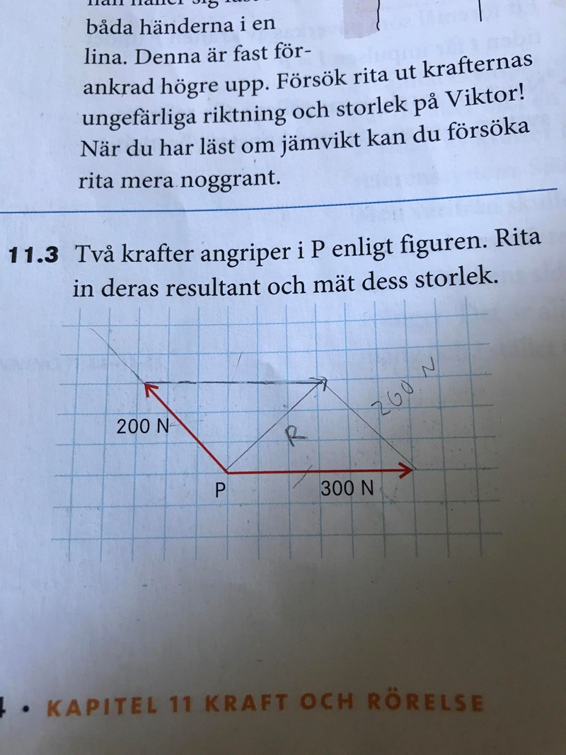 Och till nteran: Jag tycker att den pil du ritat från spetsen av 200N är lite för kort. Hur lång är 300N pilen i cm?