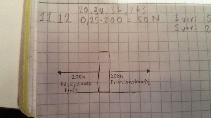 Rita figur. Rita in den påskjutande kraften 200N. Rita in en friktionskraft. Kraftresultanten ska vara noll. Vilken storlek får då friktionskraften?