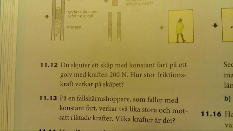 Sådär. Det där är ett skåp med en påskjutande kraft som är 200N och en friktionskraft som är 200N (som jag vet från facit). Fast konstigt nog så reducerar inte friktionskraften rörelsen till stillastående (skåpet skjuts i konstant fart)? Fast om den ena kraften är plus och den andra minus så verkar det kunna bli 0 i.a.f..