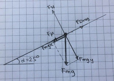 försöker lösa denna uppgift: "Christine dras uppåt av en skidlift. Hon väger tillsammans med skidor och övrig utrustning 80 kg. Backens lutning är 25 grader och man kan uppskatta friktionskraften till 0,10. Vilka krafter verkar på Christine? Hur hårt drar hon i draglinan?"