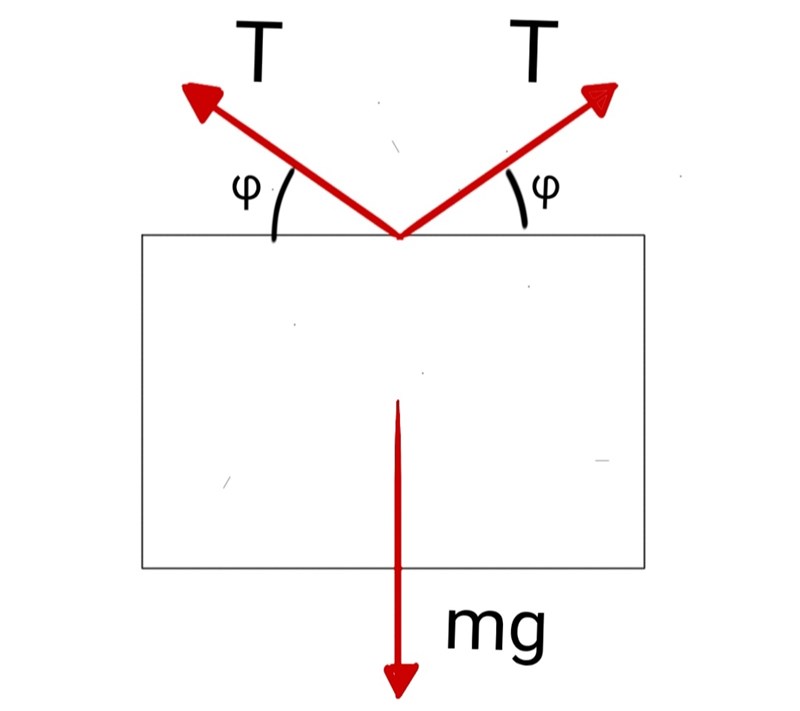 Här är T kraften i det spända snöret och mg tyngdkraften hos tavlan. Intuitionen du hade från början som Conny gjorde rätsida av var att tyngden "delas på två". Kan du bestämma för vilka vinklar som a), b) eller c) är sanna?