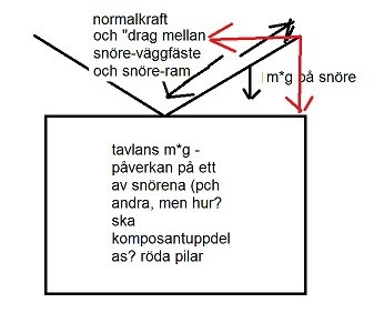 Nej, därav att jag skrev att jag förstår att det är någon slags princip jag ska försöka förstå - att jag ju tidigare hittade på en vinkel själv, men nu förstår att det inte behövs någon vinkel. Sen skrev jag en förklaring till varför krafterna på snöret är större än bara kraften neråt av tavlans massa * gravitationen, men jag vet inte om den förklaringen stämmer, så det skulle jag gärna vilja få en kommentar på.