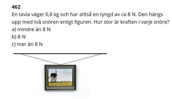 Svaret är mer än 8N. Jag är inte riktigt säker på varför. Är det att krafterna som verkar på ett snöre är dess massa*g, kraften tavlan drar med, och kraften som drar snöret mot väggen? Men borde inte ena snöret ta hälften av tavlans tyngd? Ser att detta relaterar till detta med olika fjädersystem och vilka krafter som verkar beroende på hur man kopplar fjädrar och vikt, men tycker det är klurigt.
