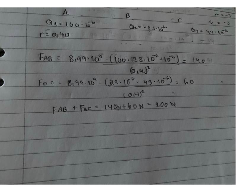Tre kulor med laddningarna +100*10^6 C, -25*10^6 V och +43*10^-6 ligger på en rad med 0,4 m mellanrum mellan varje kula. Bestäm Fres på kulan med laddningen +43*10^6 C.