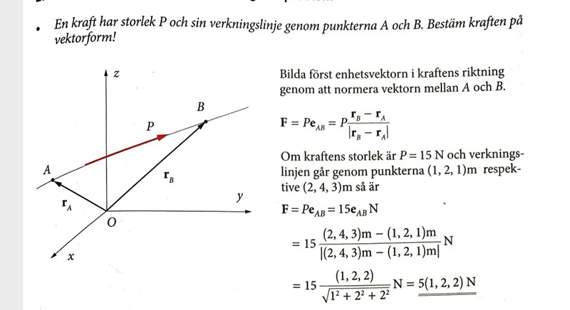 En Kraft har storleken P, dvs. kraften är en skalär (detta är min första fråga, vore det korrekt att tänka sig en sådan kraft som inte presenterats som en vektor som en skalär?), Verkningslinjen går genom A och B.
