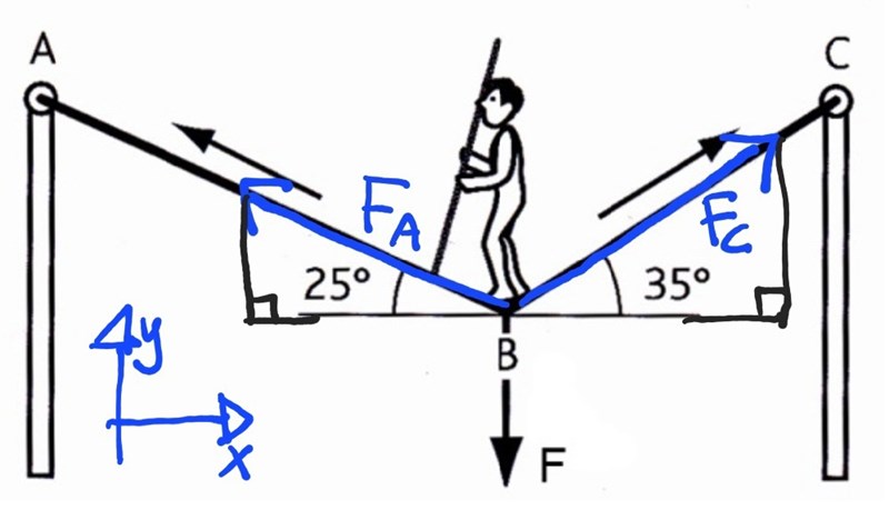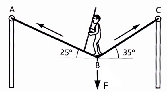 En lindansare med massan 55 kg balanserar på linan enligt figuren. Hur stora blir krafterna i lindelarna AB och BC?
