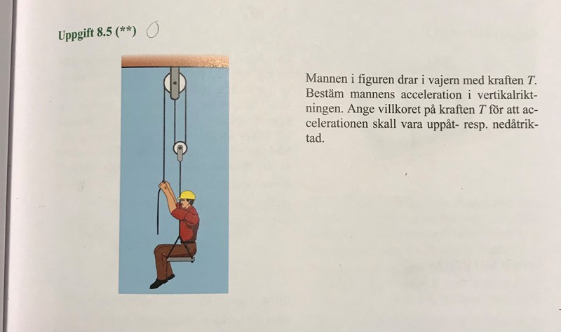 Ebola skrev:Du glömmer helt enkelt Newtons tredje lag. Mannen drar i snöret och snöret drar i mannen. När du gör en friläggning tittar du på vad som påverkar mannen vilket är 3T uppåt.