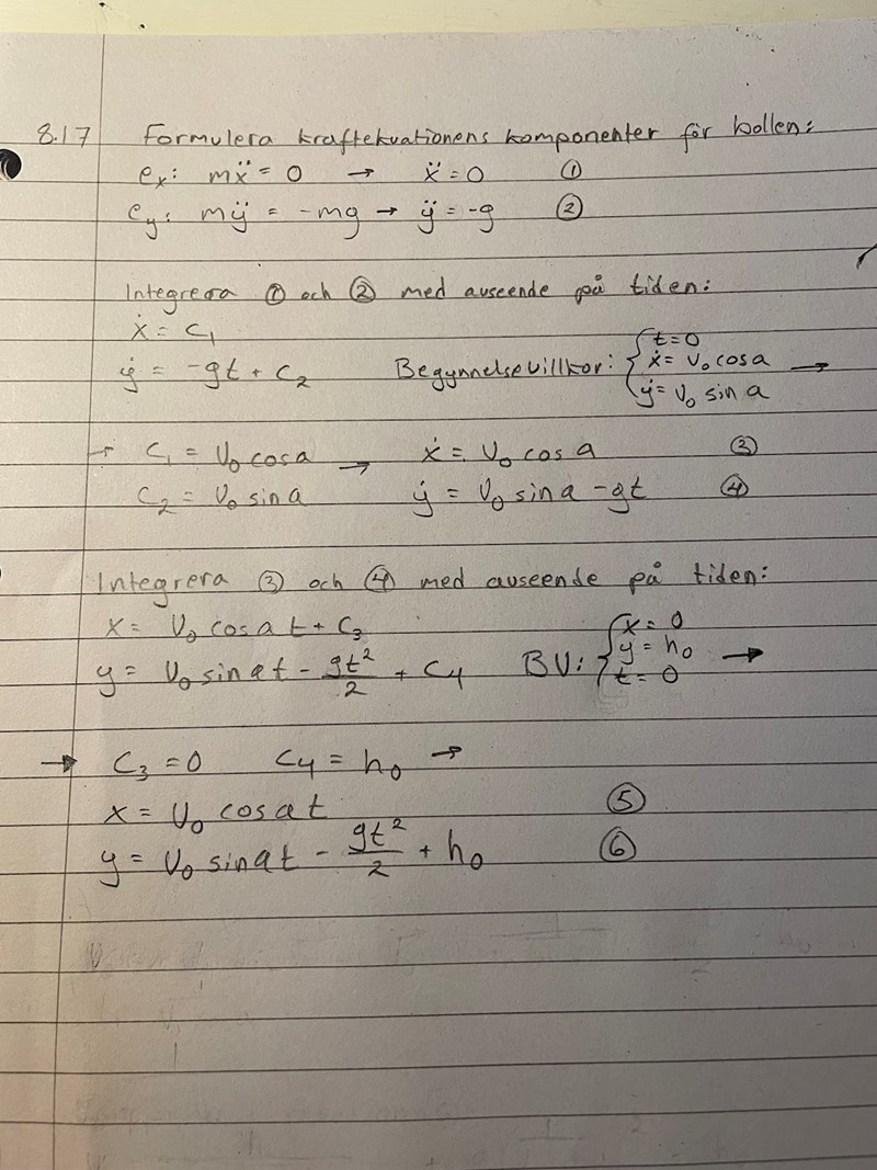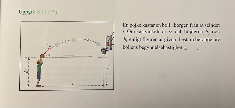 Hej, jag har kört fast i denna uppgift. Jag ska bestämma uttrycket för begynnelsehastigheten v0 men kommer inte vidare med mina beräkningar. Hur kan jag lösa detta?