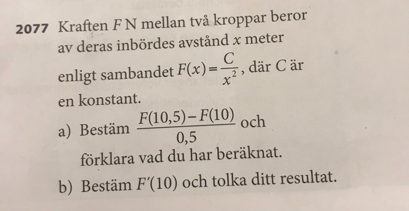 Har fått fram att svaret i a) är -0,00185 men det jag undrar är varför man skriver -0,00185 N/m som svar. Alltså det är N/m som jag inte riktigt förstår.