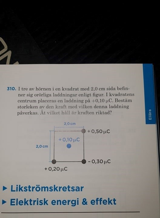 Räkna ut kraften mellan centrumladdningen och en hörnladdning i taget. Avståndet du ska ha med är sträckan från ett hörn till centrum, dvs cm