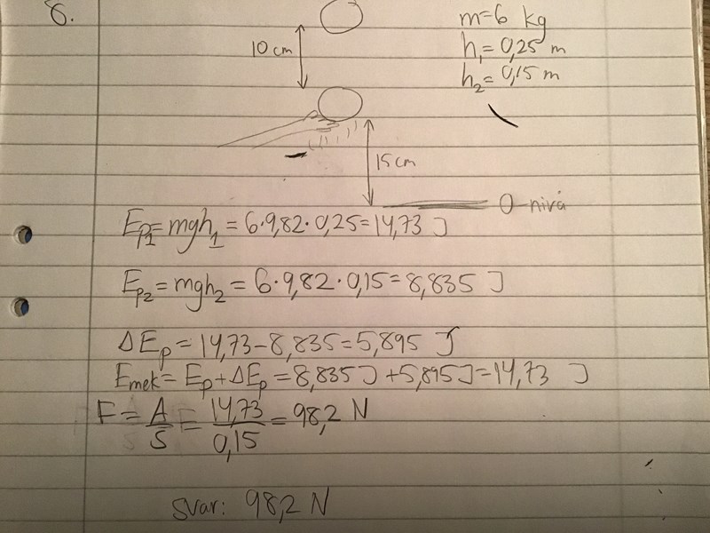 Farbrorgul skrev:En kompis ger dig ett bowlingklot som väger 6 kg genom att släppa så att du får ta emot det i luften. Klotet faller 10 cm innan det kommer i kontakt med dina händer. Du vill bromsa klotet till vila innan det faller ytterligare 15 cm. Med hur stor uppåtriktad kraft måste dina händer verka på klotet för att detta ska ske?