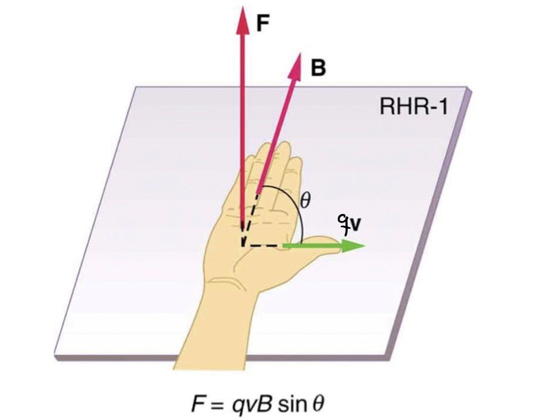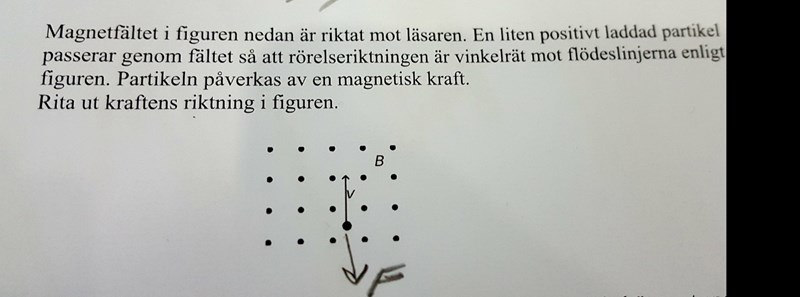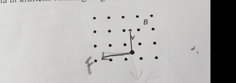 Kraften skall vara vinkelrät både mot hastigheten och magnetfältet. Så kraften kan kan vara till vänster, som du ritat, eller till höger. För att avgöra vilket så behöver du använda högerhandsregeln. Vad säger er kursbok om detta?