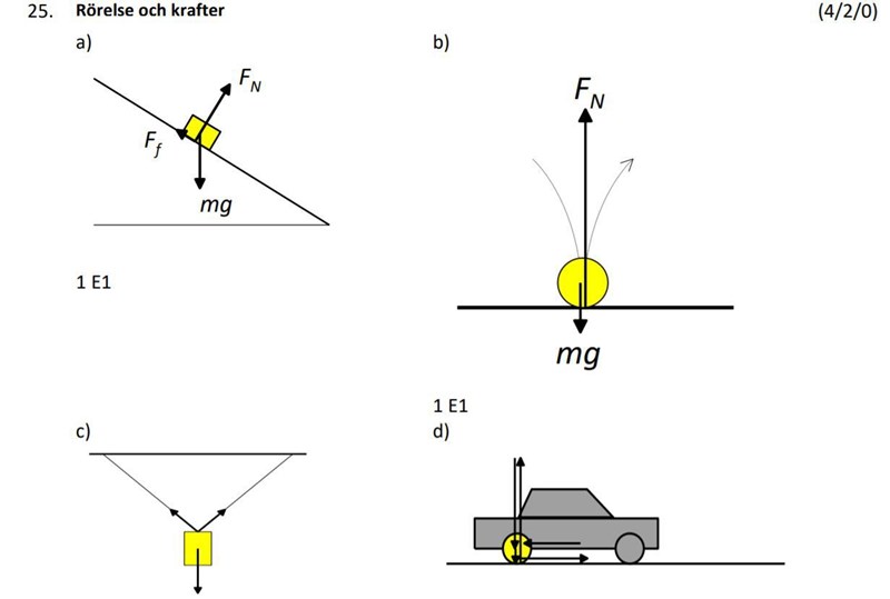 Sedan på d), det ser ju väldigt stökigt ut tycker jag. Ska inte gravitationskraften finnas med där också?