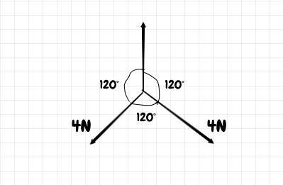 Tre vågräta krafter verkar på samma kropp. Vinkeln mellan varje kraft är 120°. Två av krafterna alstras av dynamometrar, som avläses till 4 N vardera. Hur stor är den tredje kraften om kroppen befinner sig i vila?