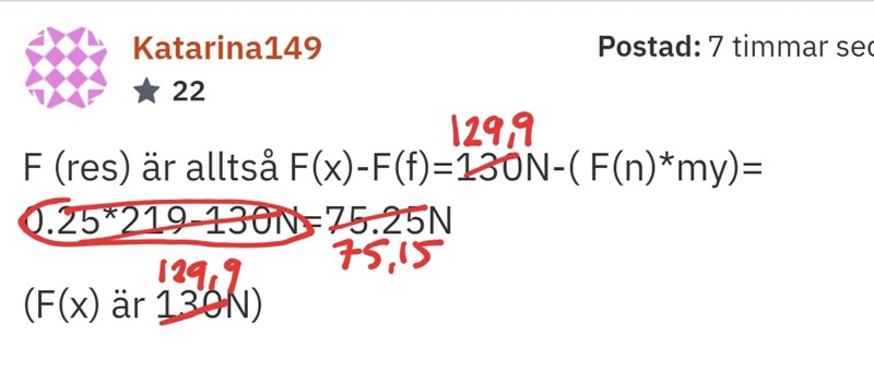 Fx=129,9F_x=129,9 och du har kastat om termerna i mellansteget (inringat). Resulterande kraft blir 75,15 N.