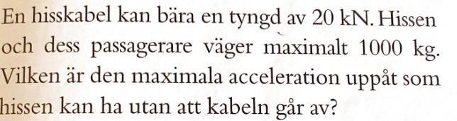 Detta stämmer överens med det svar som återges i facit. Men då tar man bara hänsyn till passagerarnas massa och inte själva hisskorgens, det står ju att hisskabeln tål 20kN, ska man räkna med att de räknat med hela hisskorgen i det då eller?