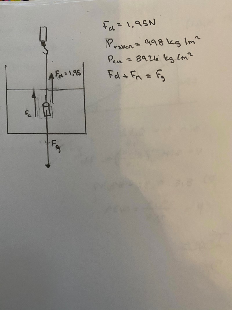 En kopparcylinder hänger i en dynamometer. Kopparcylindern är helt nedsänkt i vattnet. Dynamometern visar 1,95N. Bestäm kopparcylinderns massa.