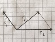Tre krafter F1, F2 och F3 håller varandra i jämvikt. De två första krafterna är ritade i figuren, Rita in kraften F3 i samma figur och bestäm dess storlek i skala.