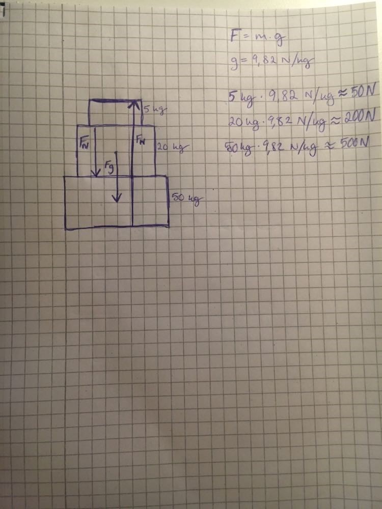 Förslag: Gör en ny bild, där du ritar den mittersta lådan med heldragna streck och de båda andra med streckade linjer. Du skall rita in kraften från den översta lådan som trycker neråt och kraften från lådan som trycker tillbaka, tyngdkraften från själva lådan och kraften från underlaget (undre lådan) som gör att lådan (och lådan ovanpå) inte trillar ner. Summan av alla krafter skall vara 0, eftersom lådan är i vila.