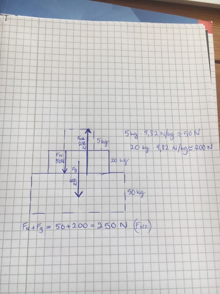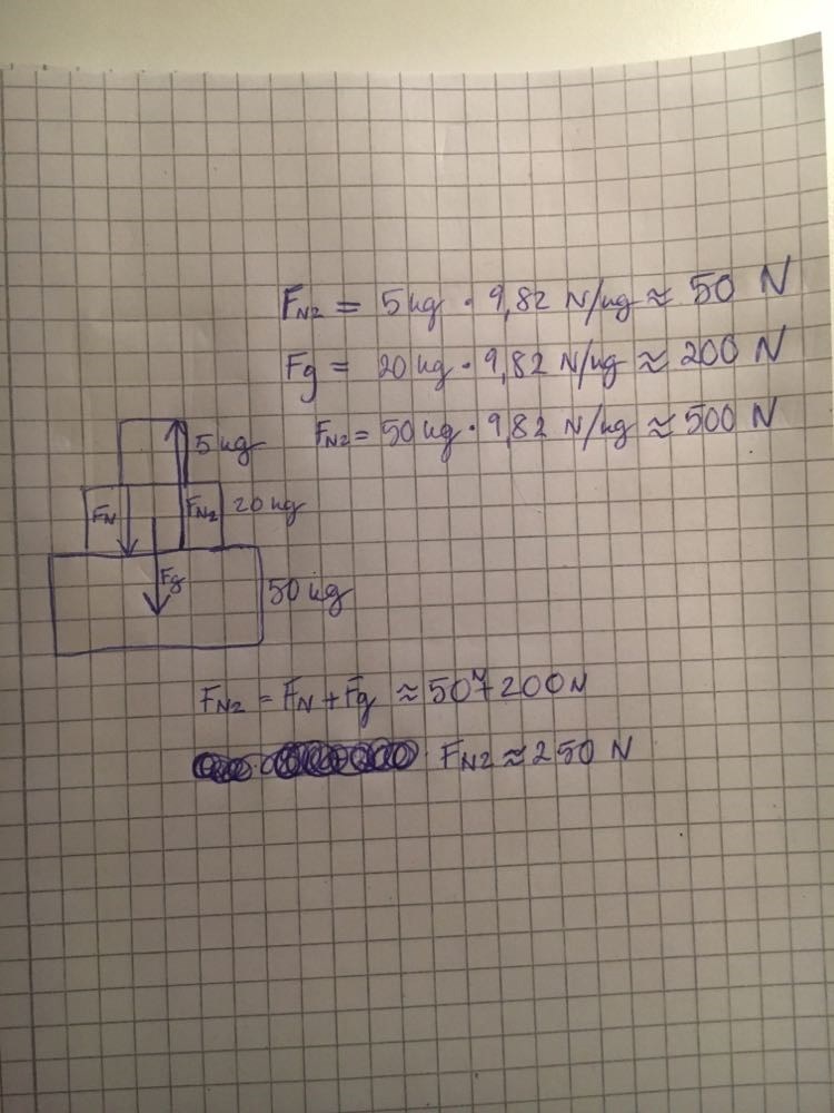 FN är 50 FN2 är 500 N men enbart 250 N av de 500 N verkar på mittersta lådan