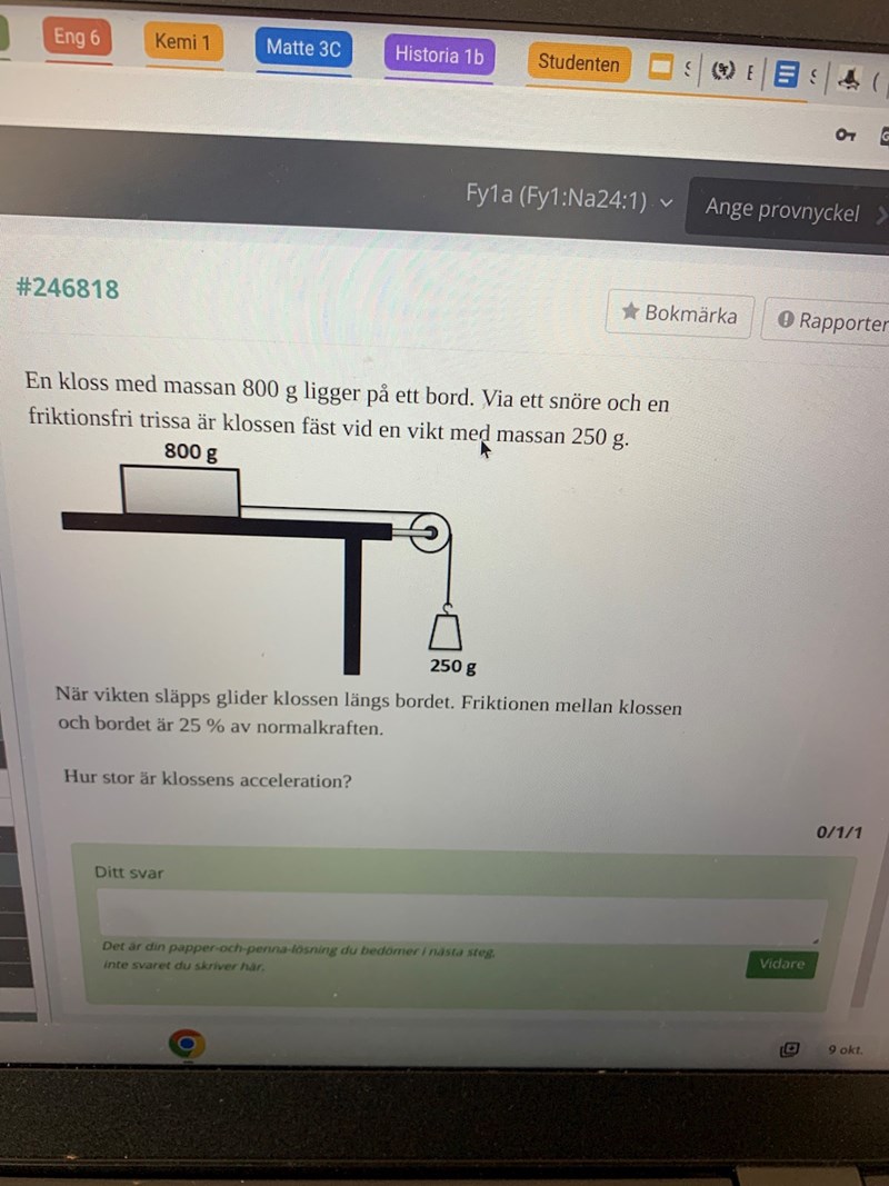 Från början håller man fast vikten, sedan släpper man vikten så att den kan falla neråt och dra med sig klossen som glider åt höger.