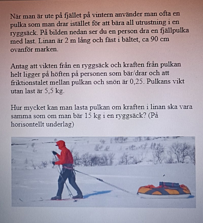 Antag att vikten från en ryggsäck och kraften från pulkan helt ligger på höften på personen som bär/drar och att friktionstalet mellan pulkan och snön är 0,25. Pulkans vikt utan last är 5,5 kg.