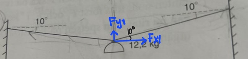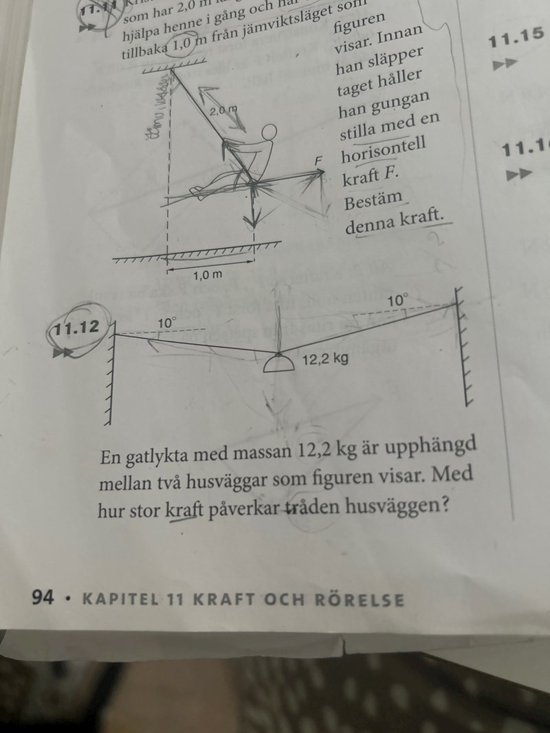 - I vertikal led: Fy1+Fy2+mg = 0, där mg är tyngdkraften som verkar på gatlyktan.