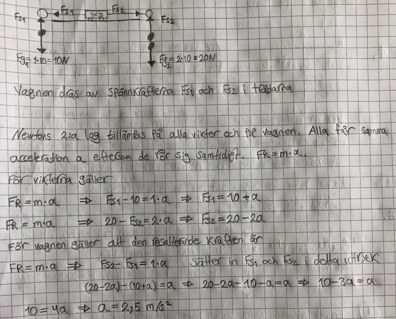 Så det som man ska definiera är inte uppåt eller nedåt när det gäller accelererande föremål utan man ska definiera/ta reda på vilken riktning föremålet accelererar. I detta fall är accelerationsriktningen åt höger då vikterna till höger har större massa och vagnen dras/accelerera därmed i höger riktning.