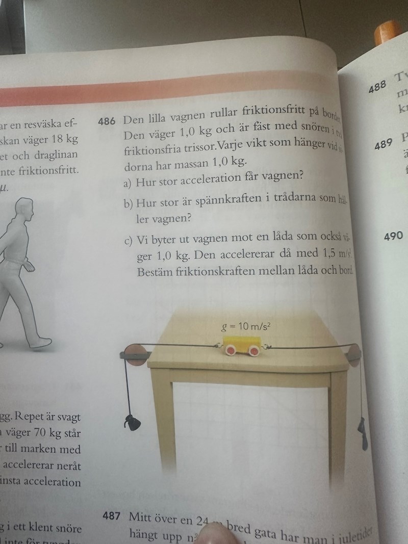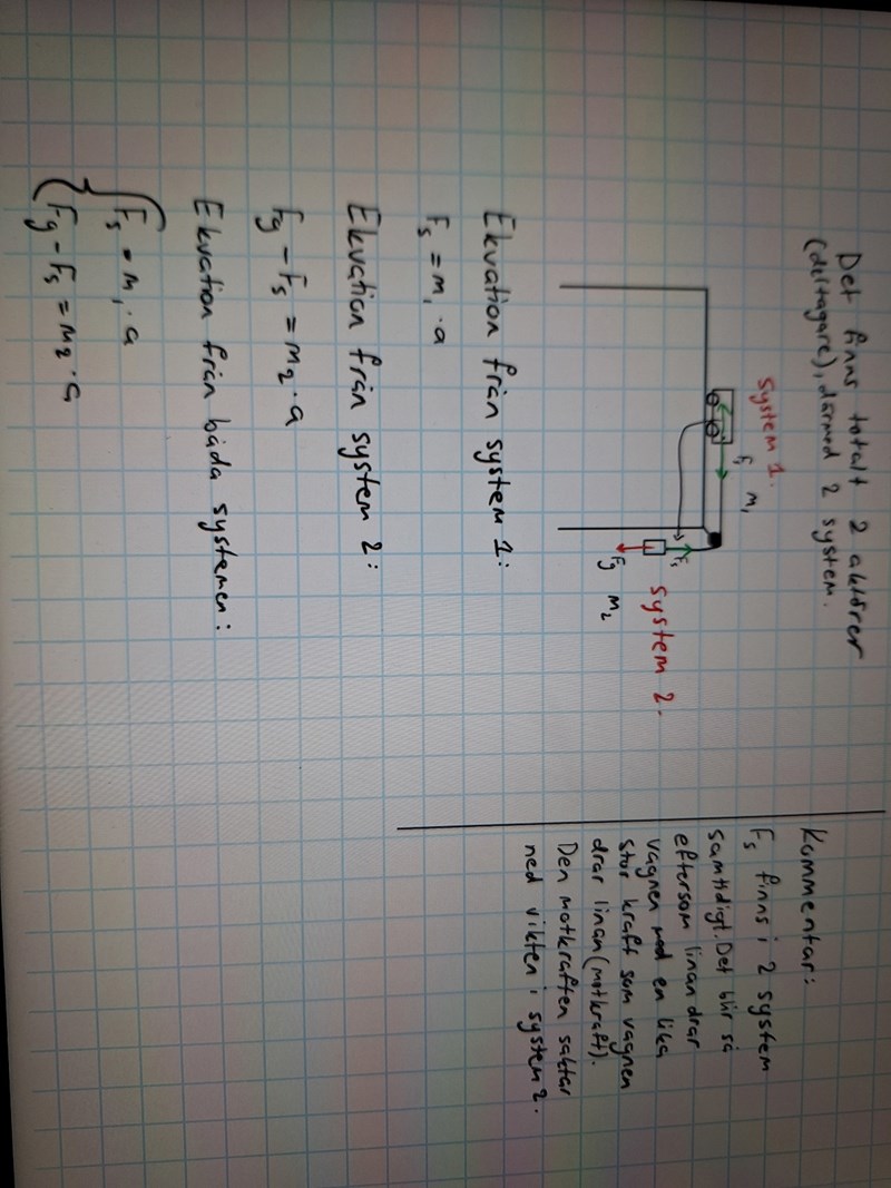 Rita ut alla krafter som finns på bilden, därefter kan du dela in vikten på vänster sida, vagnen och vikterna på höger sida i olika "system". Jag kan visa ett exempel på vad jag menar.