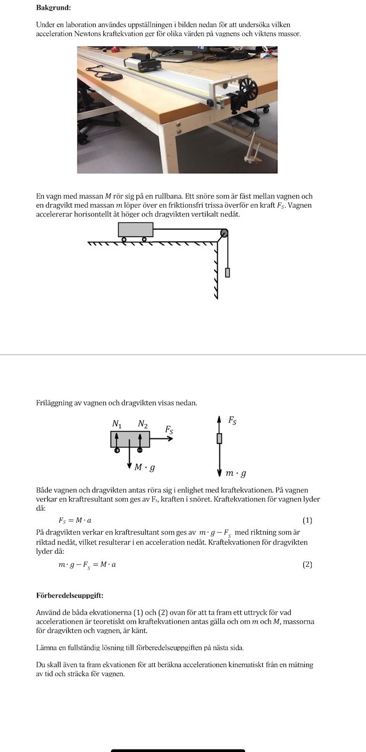 likaså när de menar ” Ta fram en ekvationen för att beräkna accelerationen kinematiskt från en mätning av tid och sträcka för vagnen.”