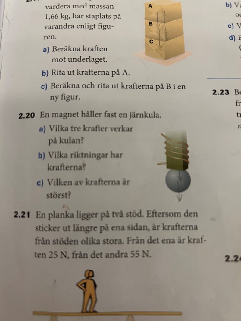 Jag har denna 2.20 b som jag behöver lite hjälp med. I facit står det att tyngdkraften och normalkraft verkar nedåt från magneten. Men verkar inte tyngdkraften neråt från kulan?