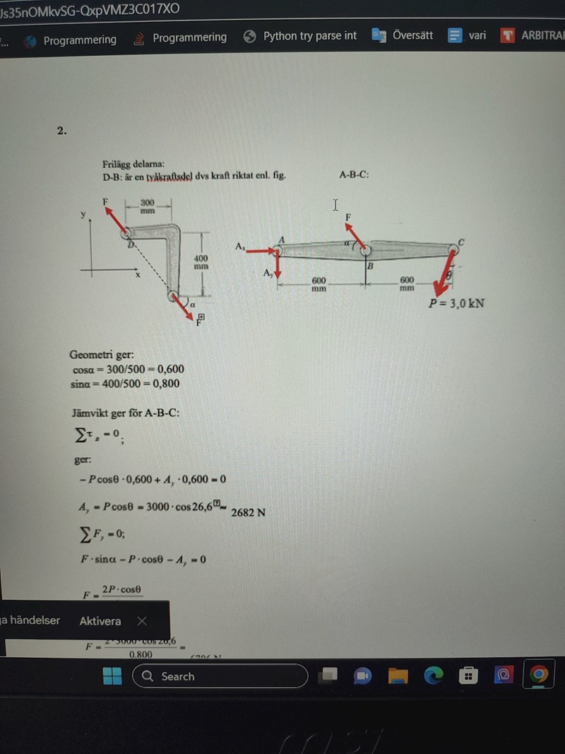 Men de har skrivit -P*cos(alfa)*0,600 + Ay*0,600 = 0?