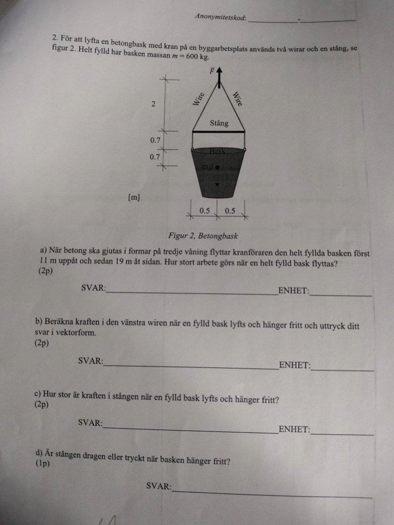 För att det ska bli tydligt: Frilägg varje del, (krok, wire, tvärstag och balja) rita ut samtliga krafter och komposantuppdela i x och y led där det behövs.