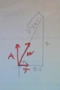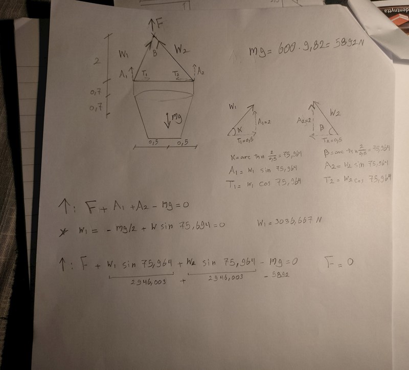 A får vi genom att titta på baljan, mg verkar nedåt, som fördelas på två krafter uppåt, vardera mg/2. A är alltså mg/2