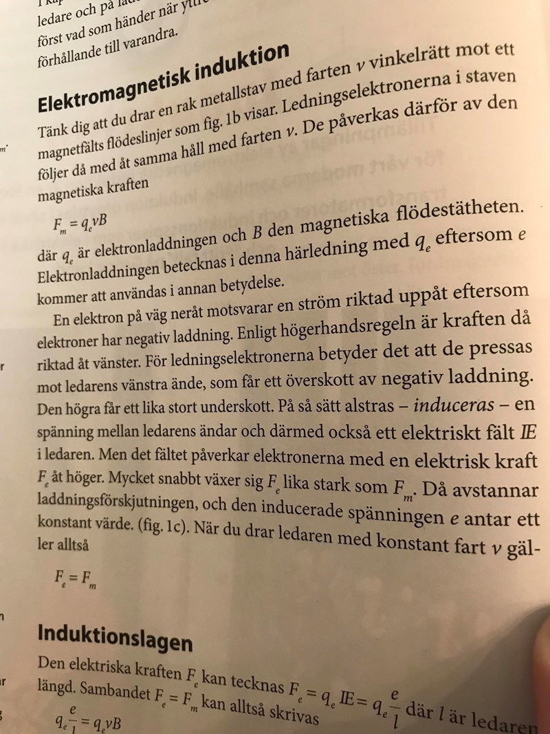 Till denna bild visas en metallstav som rör sig nedåt, och som texten säger rör sig strömmen då uppåt vilket ger en magnetisk kraft åt vänster, som i sin tur ger en elektrisk kraft åt höger...