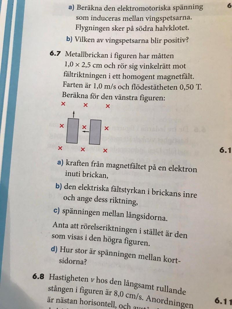 Brickan rör sig ju uppåt, därför tänker jag att elektronerna också gör det, vilket ger "strömriktningen" (tummen i högerhandsriktningen) nedåt. Detta i sin tur ger en magnetisk kraft åt höger, vilket gör att den högra sidan blir negativ och det elektriska fältet som efterfrågas i b går från höger till vänster.