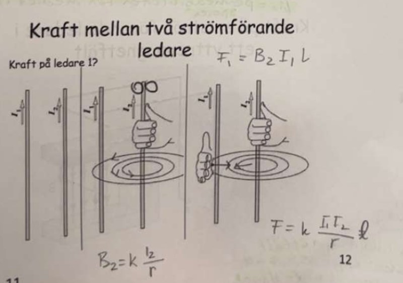 Om ledare 1 befinner sig på det avståndet så gäller F1=B2I1l. Det är kraften mellan ledarna där l är längden där de båda ledarna är parallella. Sätter vi in uttrycket för B2 här så får vi den tredje formeln.